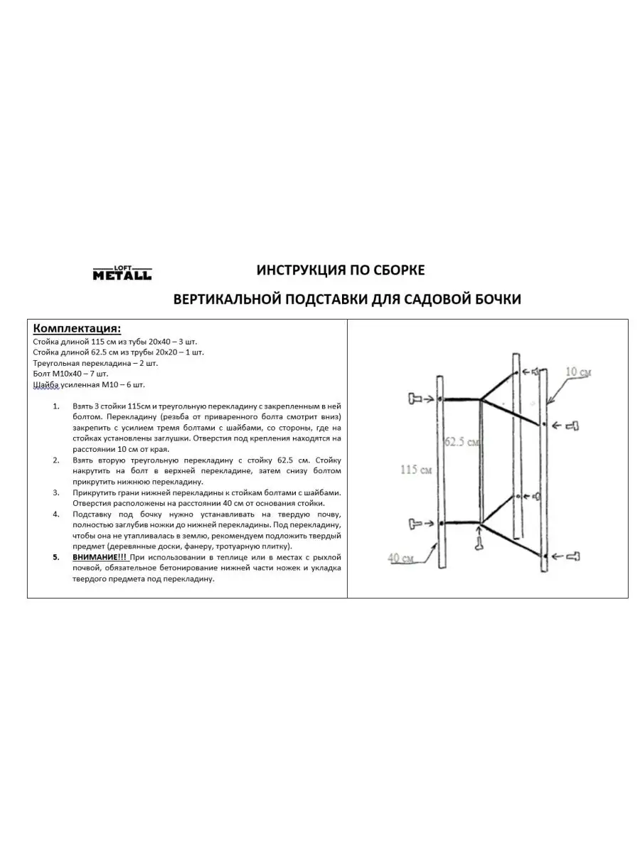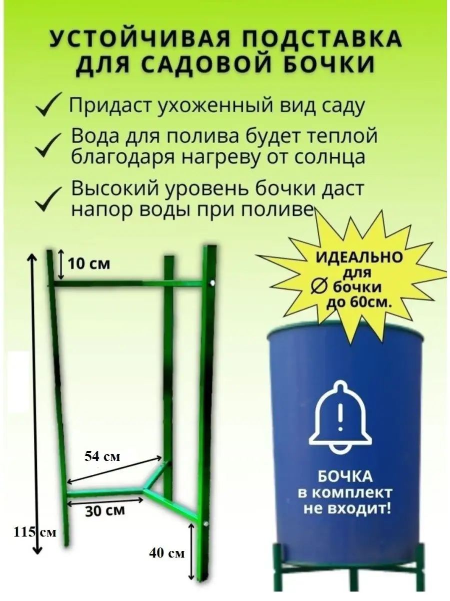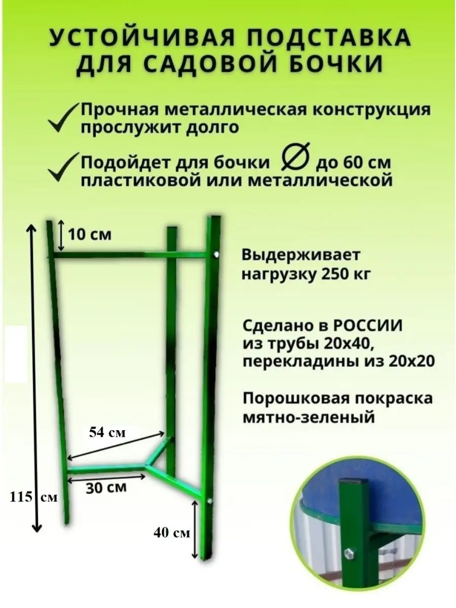 Подставка для садовой бочки - прочная и надежная конструкция для сбора дождевой воды и устройства системы полива в саду и огороде. Металлическая опора для бочки поднимает садовую емкость высоко над землей - за счет этого полив растений идет с хорошим напором воды. Опора для садовой бочки выдержит вес более 250 кг и подходит для бочки для воды диаметром до 54 см. К емкости для воды, которую вы установите на подставку для бочки легко прикрепить поливочный шланг и организовать в саду или огороде капельный полив растений или полив из шланга с распылением. Высота конструкции 115 см, ширина 54 см. Крепеж, инструкция по сборке в комплекте. **ВНИМАНИЕ!** Подставку под бочку нужно устанавливать на твердую почву, полностью заглубив ножки до нижней перекладины. Под перекладину, чтобы она не утапливалась в землю, рекомендуем подложить твердый предмет (деревянные доски, фанеру, тротуарную плитку). При использовании в теплице или в местах с рыхлой почвой, обязательное бетонирование нижней части ножек и укладка твердого предмета под перекладину. Затяжка болтов с хорошим усилием.