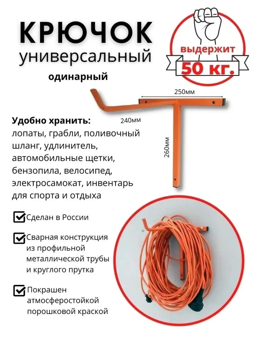 Универсальный настенный металлический крючок - система хранения садового инструмента в гараже, сарае, мастерской, на балконе, в прихожей. Все наши крючки настенные выдерживают до 50 кг! Металлический кронштейн для хранения и подвеса садового инвентаря (триммер лопата грабли поливочный садовый шланг), строительных инструментов (электропила шуруповерт), спортивного инвентаря (велосипед, лыжи, самокат, тюбинг, удочки, лыжи, сноуборд). Кронштейн для велосипеда при горизонтальном расположение велосипедов вдоль стены занимает меньшую площадь,чем вертикальное крепление. Держатель для инструментов садовый настенный наведет порядок в системе хранения спортивного инвентаря и садового инструмента. Сварная конструкция из профильной металлической трубы. Атмосферостойкая порошковая краска оранжевого цвета защищает поверхность от царапин и повреждений, предотвращает ржавчину крючков. Крепеж в комплекте - саморезы и дюбели подходят для любой поверхности. Отличный подарок папе, дедушке, другу, коллеге.