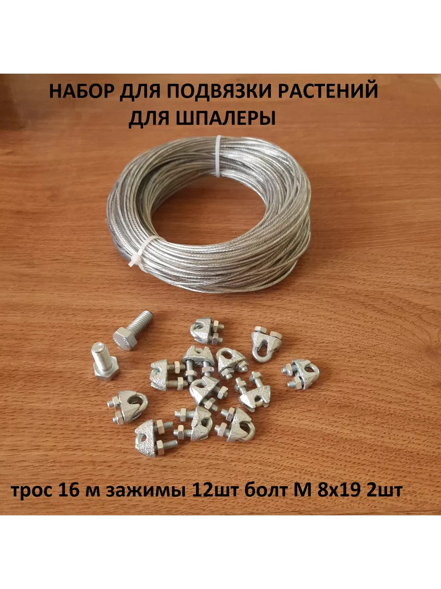 Подвязка для растений садовая металлическая. Стальной трос в пвх оплетке, толщиной 2мм. ПВХ оболочка защищает трос от воздействия влаги, бережно поддерживает растения, не повреждая ветки, многофункциональное применение в садоводстве. Набор металлических струн в мягкой оплетке идеально подойдут для подвязки растений в парнике, на шпалере и дугах. В комплекте с оцинкованным тросом 12 прочных крепких зажимов (способность выдерживать нагрузку до 60 кг.) и 2 болта М8х20. Струна не травмирует руки. Никаких заноз. Не повреждает растения. Безопасные, долговечные, простые в использовании в теплице и парнике. Дополнительный комплект к набору шпалер нашего производства артикул 153903404, 154119918.