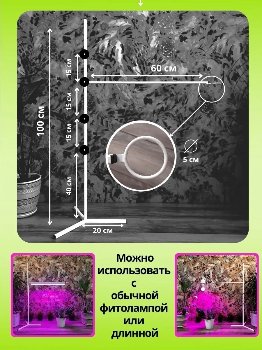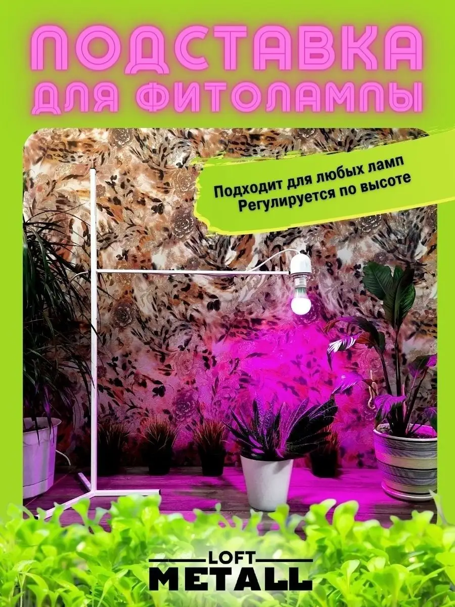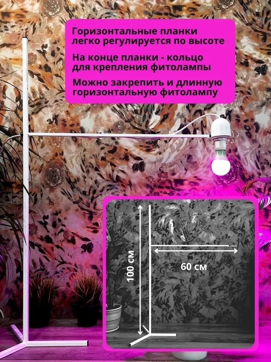 Подставка-стойка для фитолампы для рассады поможет организовать огород на подоконнике, кухне и даже в гостиной.Благодаря прочной и продуманной конструкции на металлическом стеллаже легко закрепить фитолампу для растений полного спектра. Подставка для светодиодный светильник для растений незаменимая вещь для выращивания рассады. Высота стойки для фитосветильника регулируется на высоту до 100 см, 5 положений с шагом 15 см. Одна перекладина держателя для лампы для растений 60 см + кольцо 5 см. Подойдет для любой светодиодной лампы Эра и линейных светильников Uniel и других. Подставка для линейных светильников. Варианты размещения линейного светильника и светодиодной лампы для растений на фото. Держатель для фитолампы сделан из прочного металла (10на10мм), покрашен качественной порошковой краской белого цвета. Конструкция для фитосветильника разработана и сделана в России, на нашем собственном производстве. Опора для фитосветильника легко собирается, крепеж в комплекте. ВАЖНО фитолампа для растений в комплект не входит!