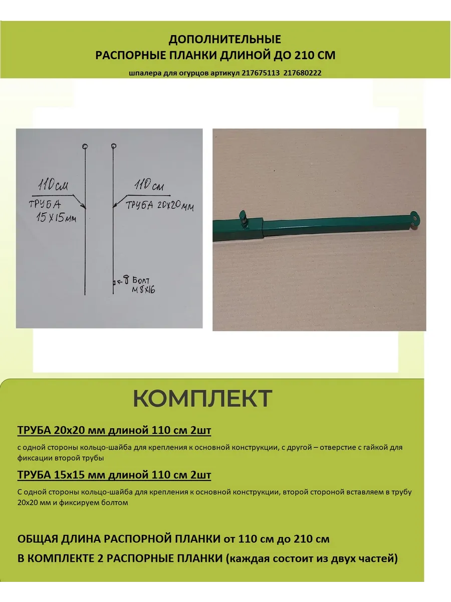 Дополнительная распорная планка для шпалеры для огурцов позволяет увеличить расстояние между опорами до 2.1 метра. Горизонтальная перекладина состоит из 2 труб. Одна труба 20х20 мм, толщиной 1.5 мм длиной 110 см. С одной стороны у неё приварено кольцо-шайба для крепления к основной конструкции шпалеры, с другой стороны есть отверстие с гайкой для фиксации второй трубы. Вторая труба 15х15 мм толщиной 1.5 мм длиной 110 см. У неё также с одной стороны кольцо-шайба, второй стороной вставляем в трубу 20х20 мм и фиксируем болтом М8х16