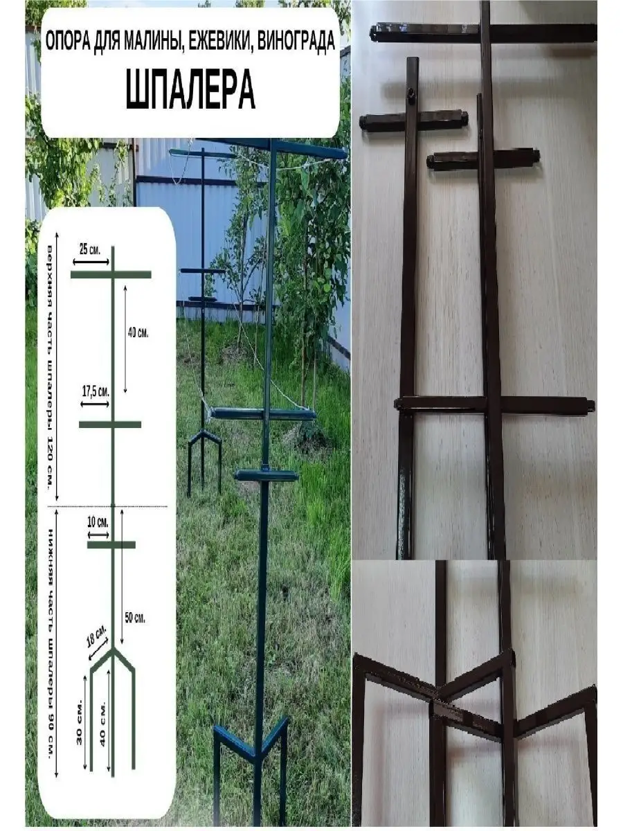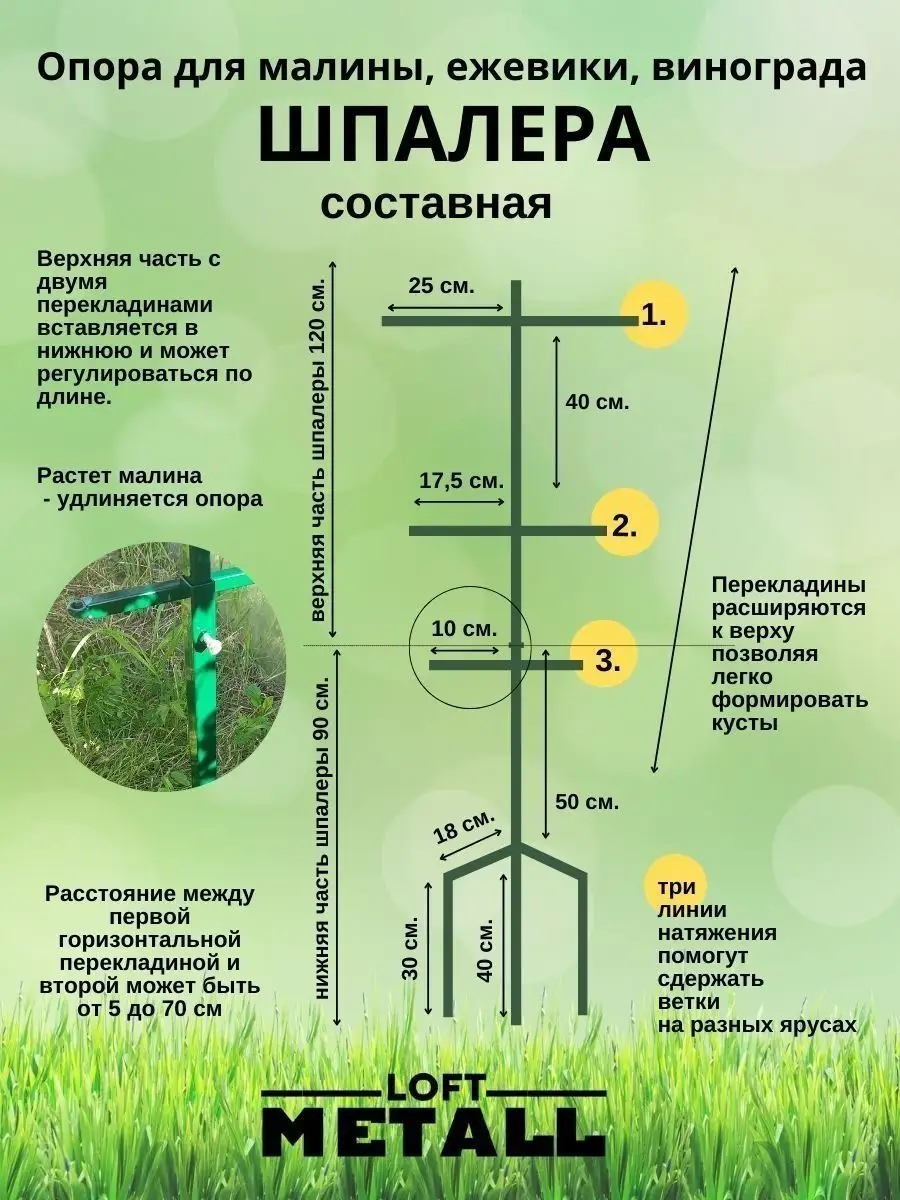 Наш металлическая шпалера — это универсальный кустодержатель, который подойдёт не только для малины, но и для других вьющихся растений, декоративных кустарников и деревьев: винограда, роз, огурцов, ежевики. Такой держатель станет незаменимым помощником в вашем саду, огороде, на даче.