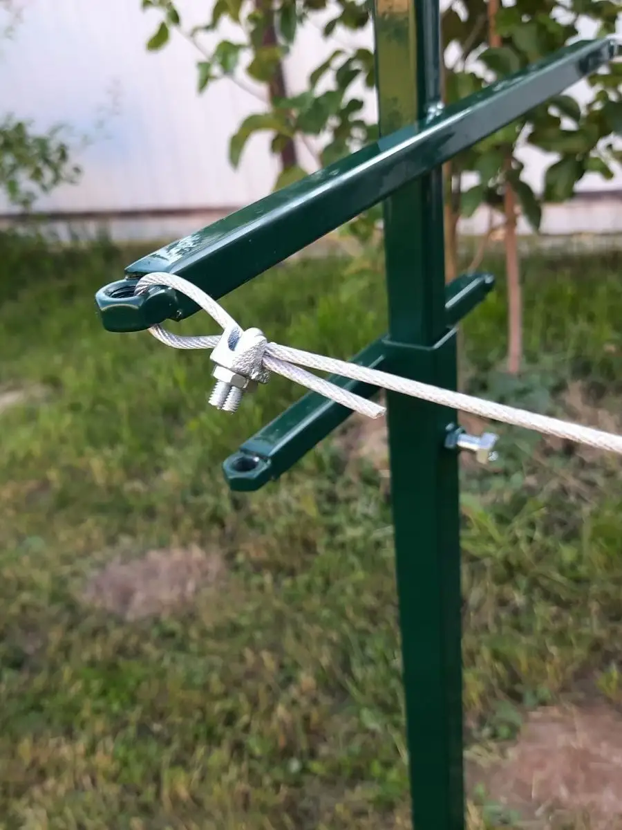 В комплект входит 2 вертикальные разборные стойки. Высота изделия регулируется от 80 до 160 см. Набор крепежа, 16 метров троса (стальная проволока в ПВХ оплетке) и его фиксаторы. Рекомендуем устанавливать на расстоянии 2-2.5 метра друг от друга. Собственное производство, на прямую от производителя. Кронштейн для сада – незаменимый инвентарь садовода.